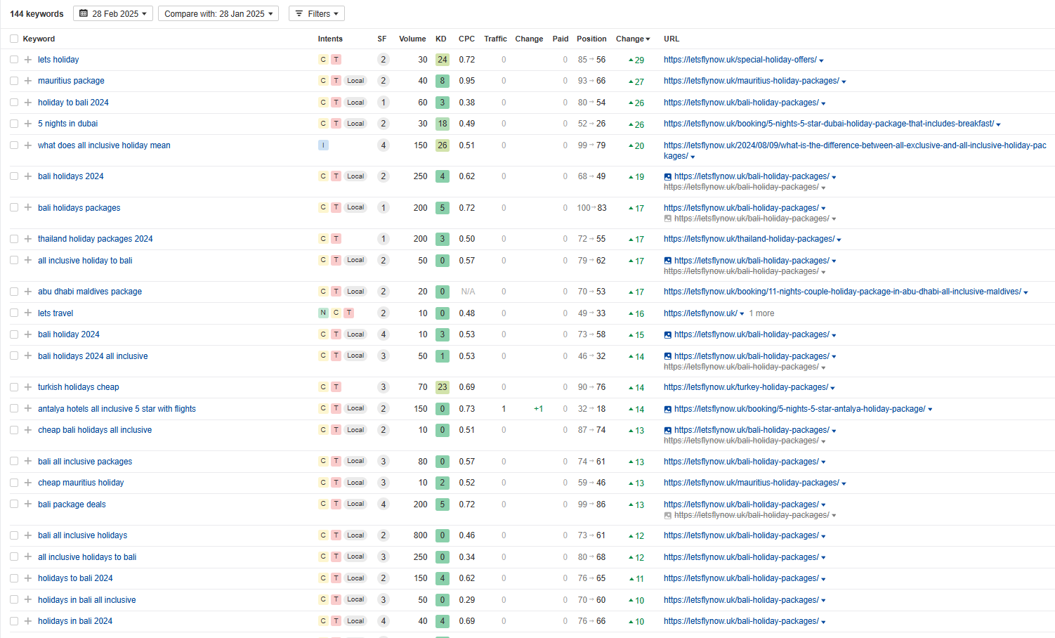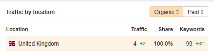Your site is getting 100% traffic from the United Kingdom, and due to our work, there are 144 new and improved keywords compared to last month.