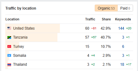 Your site is getting traffic from the top five countries below, and there are 31 new and improved keywords compared to the last month due to our work.