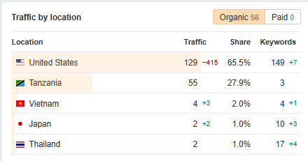 Your site is getting traffic from the top five countries below, and there are 418 new and improved keywords compared to the last month due to our work.